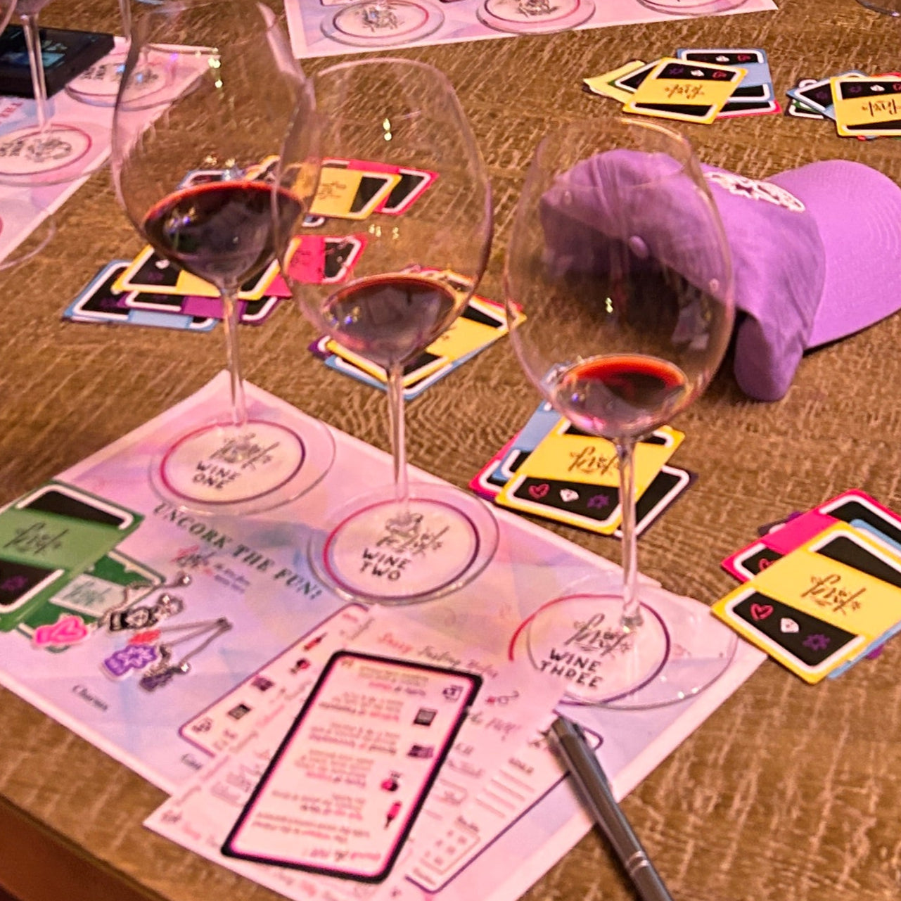 Prepare the tasting mats with cards, charms and sassy note sheets. Dress the bottles & pour the wine.