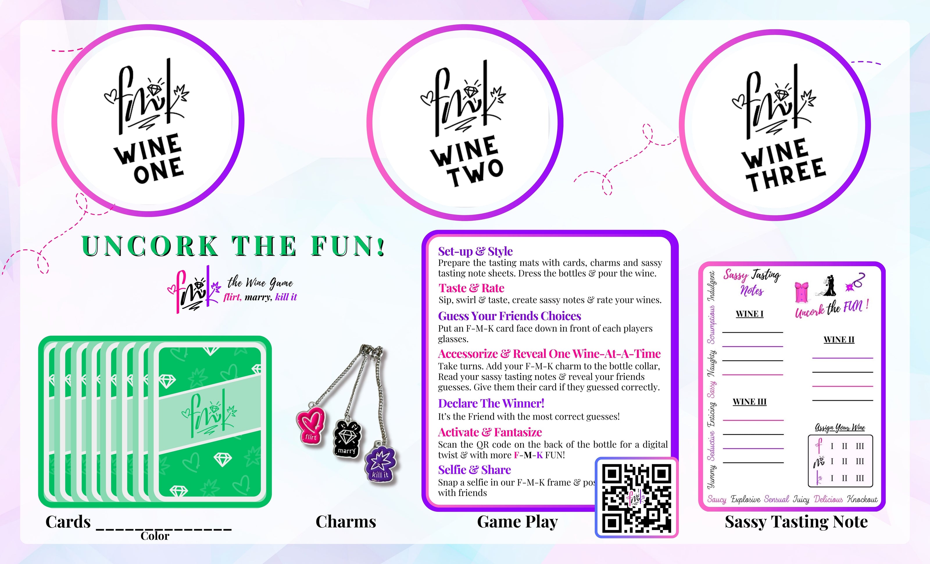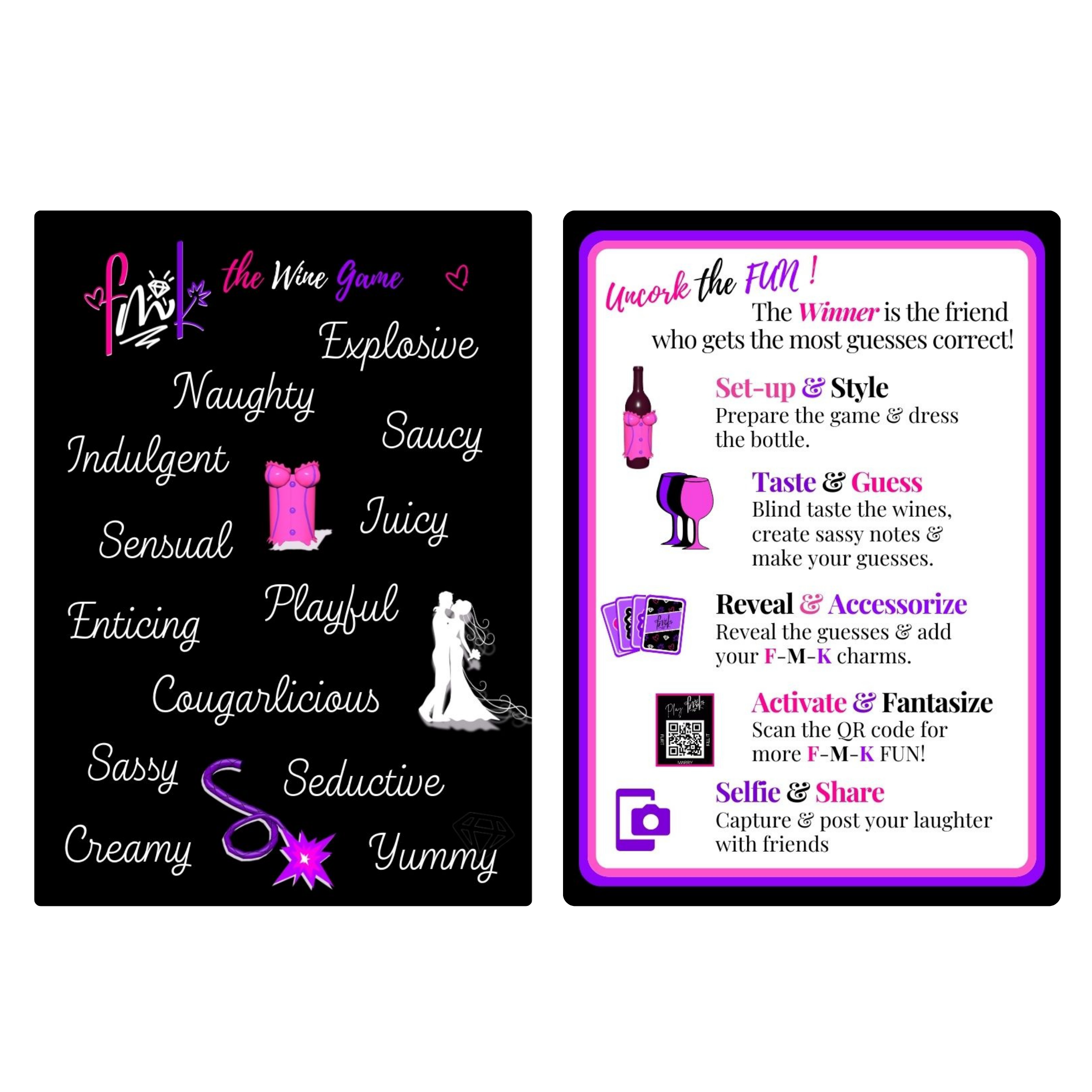 Take turns. Add your F-M-K charm to the bottle collar, read your sassy tasting notes & reveal your friends guesses. Give them their card if they guessed correctly.